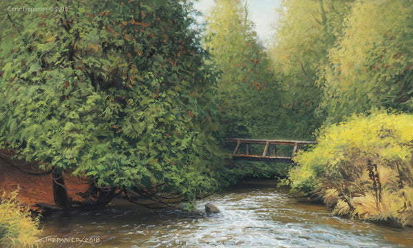 “The Humber River has woven its way around my life for over 3 decades. One of its smaller tributaries runs through my backyard, home to small speckled trout and a myriad of other life forms. I found this lovely view hiking along the Humber's main flow, only a few minutes drive and a short hike from my studio. In the thick cedar forest, rusty-red specks dotted the trees and covered the ground. Summer had come to an end.” - Cory