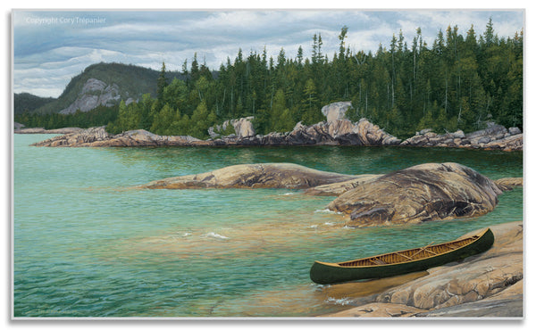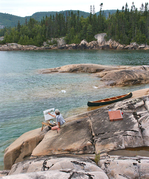 Sitting atop a rocky point, these observations led to my midday attempt at capturing these alluring qualities of the great lake. As I was setting up to begin painting, serendipity paid a visit. For this stretch of the coast, we were joined by friends who had two young daughters the same age as ours. While they played together, James roamed the waters with his lovingly rebuilt canvas covered canoe that I had eyed since he first put it in the water. Hearing a gentle thump against the shore caused me to look up. Oblivious to what I was working on, James had pulled his canoe ashore for a break, perfectly placed within my composition. I couldn’t resist this newly added focal point.