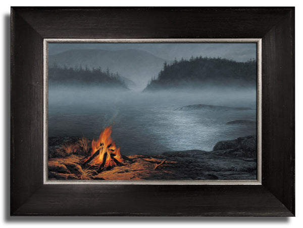 While I pulled the canoe up on the shore, I joined Janet and the kids around the little fire and we chatted for a while. By the time the girls turned in to our comfortable Eureka tent for the night, the moon had risen, and it's light danced on the water through the fog. The little fire's embers were still glowing, and the imagery was just too good to miss. I grabbed my painting gear again, and by the light of my headlight, developed a painting that will certainly bring back memories for years to come." - Cory